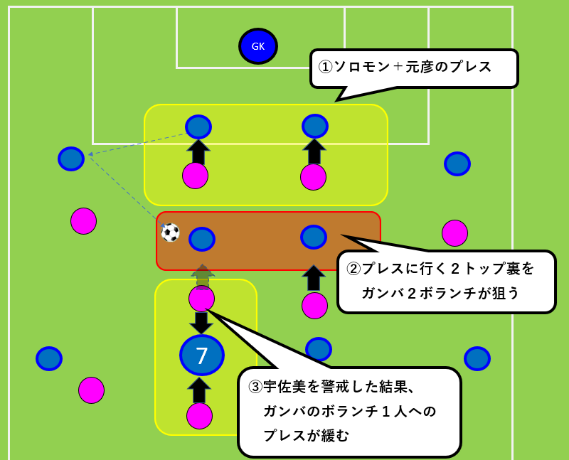 ここは、ガンバが上手かった所もあると思いますが、その1番の要因として、